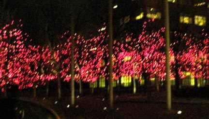 See the beautiful trees wrapped in red lights outside the Kellogg Company Headquarters.