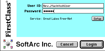 You may connect to the GLFN using direct telephone modem access, or using the Internet using a PPP account. First you must set up your software according to the method of connection you choose. To do this click on the Setup button at the Login Screen: