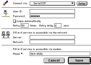 If you selected Serial.FCP, make sure the telephone number appears in the phone number box. For local calls in Battle Creek, Michigan the telephone number is 969-4536. If you have call-waiting telephone service, to shut it off for this call the telephone number you are calling should be preceded by 70 like this: 70,969-4536. In offices where you must dial 9 to get an outside line, the phone number will be 9,969-4536.