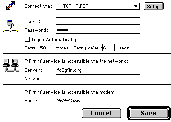 If you selected TCP-IP.FCP, type the telenet address for the GLFN in the Server box. The telenet address is: fc2glfn.org. The telephone number may be listed in the Phone # box, but it will not be used unless you change your method of connection to Serial.FCP.