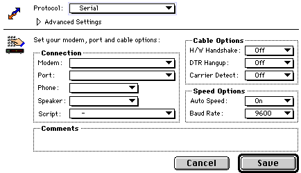 Click on the down arrow key and select your Modem from the list of modems, or you may choose to select the Generic Modem or the Hayes Modem which is highly compatible. Make sure that all your Cable Options are turned on. Your Baud Rate should match your particular modem. Leave the Auto Speed alone, because it is selected automatically according to your modem selection. When you are finished click on the Save button.