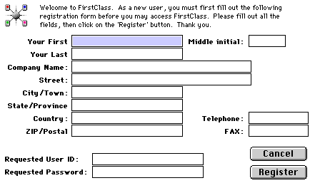 At the screen "Welcome to FirstClass", fill in all the information. Please include your area code with your phone number. You can leave the Fax number box empty, but be sure to fill in all the other boxes. We must have your complete address and your telephone to process your application.