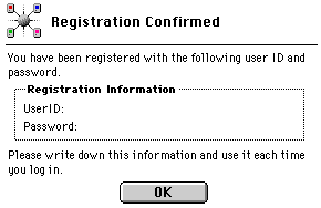 The next screen, Registration Confirmed, will contain your User ID and Password. Use your mouse to click on OK or simply press the return/enter key.