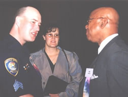 Officer Brandon Hultink and his wife Kelly are greeted after the Prayer Breakfast by Joe Stewart (right). |
